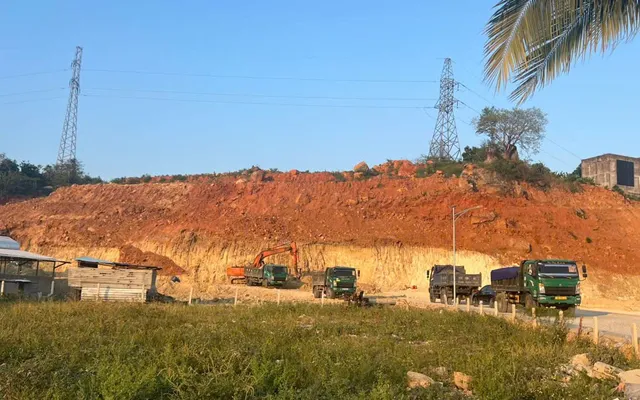 Tại hiện trường, gần như toàn bộ khu đồi đã bị đào xới, nhiều vị trí bị khoét sâu, tạo thành mặt bằng rộng. Máy múc hoạt động liên tục, nhiều xe tải ra vào chở đất đi tiêu thụ.