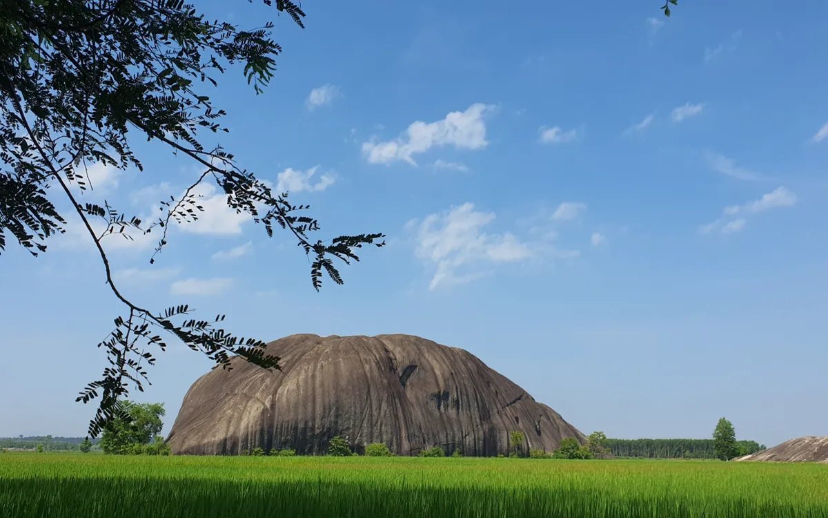 Bao quanh khối đá là những cánh đồng lúa đặc trưng của vùng quê Nam Bộ. Theo từng thời điểm trong năm, nơi đây lại mang một diện mạo khác nhau.