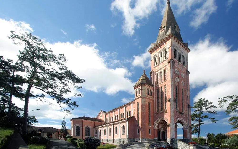 Trong khi đó, Nhà thờ Chánh tòa Đà Lạt (Nhà thờ Con Gà) mang đậm phong cách kiến trúc Romanesque của châu Âu. Với tháp chuông cao vút và những ô cửa sổ hình vòm cung, công trình này không chỉ là trung tâm tín ngưỡng mà còn là điểm nhấn kiến trúc quan trọng bậc nhất của thành phố. Hình tượng con gà bằng đồng trên đỉnh tháp chuông – biểu tượng của sự sám hối và cảnh giác theo điển tích Kinh Thánh – đã trở thành một phần ký ức không thể thiếu của người dân phố Hội nói riêng và người Đà Lạt nói chung.