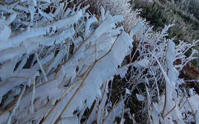 Theo ghi nhận vào khoảng 7h30 sáng 10/1, khu vực đỉnh Fansipan ở độ cao 3.143 m xuất hiện lớp băng tuyết dày, phủ trắng các bậc thang, chóp đỉnh cũng như thảm thực vật xung quanh. Những tinh thể băng kết dính trên cỏ cây, hoa lá, lan can và các công trình trên đỉnh núi, tạo nên bức tranh thiên nhiên tương phản rõ nét giữa sắc trắng của băng tuyết và màu sẫm của đá núi.