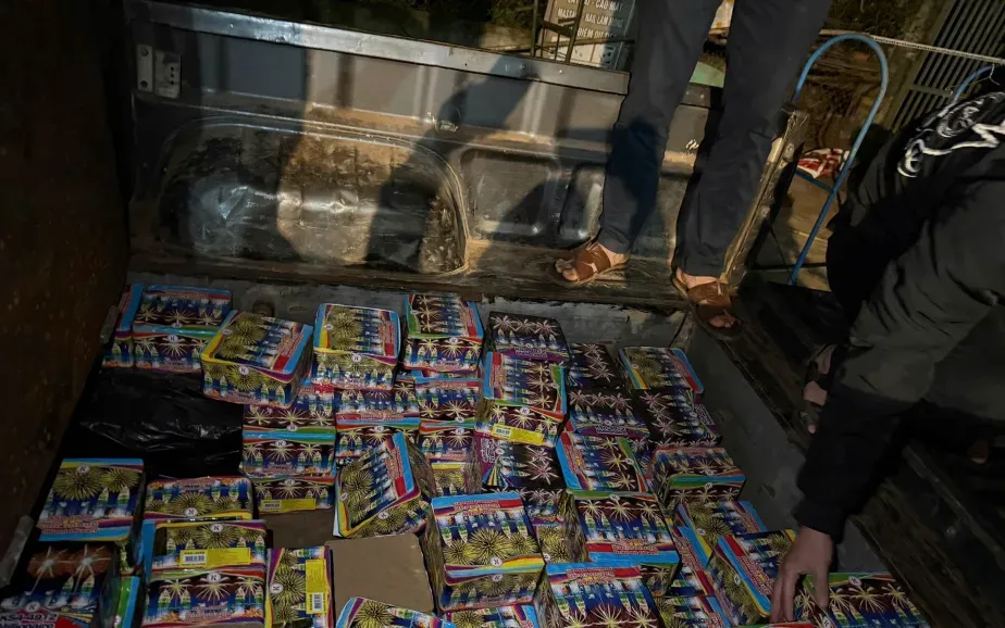 Bên trong khoang độ chế này có 114 khối hình hộp chữ nhật, trên bao bì in chữ nước ngoài, với tổng trọng lượng hơn 190kg. Qua làm việc, Đạt khai nhận toàn bộ số hàng trên là pháo hoa nổ.