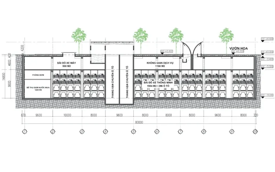 Dự án có quy mô khoảng 2.160 m2, được thiết kế với 2 tầng hầm. Tầng hầm 1 dành cho khu dịch vụ thương mại, kỹ thuật và bãi đỗ khoảng 110 xe máy. Tầng hầm 2 lắp đặt hệ thống tự động 4 tầng, đáp ứng gần 270 xe ô tô.