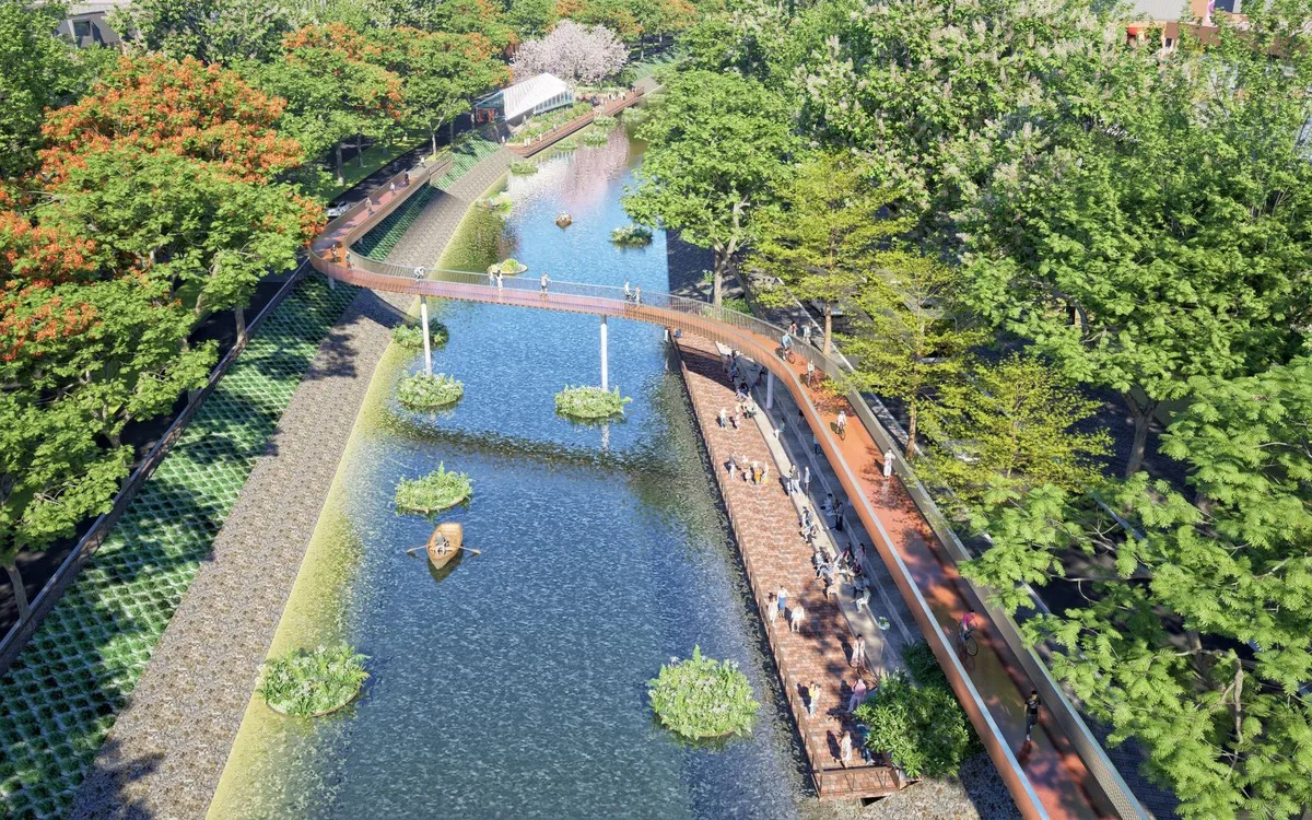 Đoạn sông từ Hoàng Quốc Việt đến cầu Mới (Ngã Tư Sở) dài hơn 6 km sẽ đóng vai trò là trục không gian mở xuyên suốt phía Tây nội đô. Đoạn đầu nguồn từ Hoàng Quốc Việt đến Cầu Giấy được định hướng xây dựng các quảng trường và không gian cộng đồng lớn. Trong khi đó, đoạn từ Cầu Giấy đến đường Nguyễn Trãi sẽ tập trung vào các giá trị văn hóa truyền thống, gắn liền với các lễ hội đặc trưng của địa phương. Cách tiếp cận này không chỉ cải thiện diện mạo đô thị mà còn gìn giữ và phát huy bản sắc lịch sử vốn có của dòng sông huyền thoại.