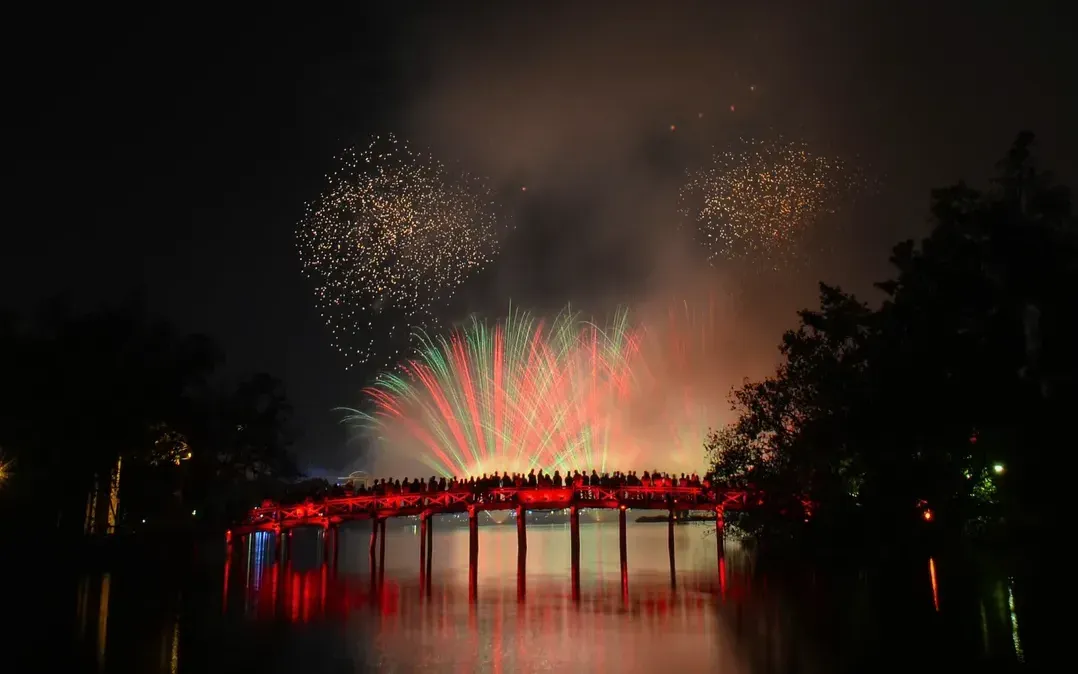 Tại khu vực hồ Hoàn Kiếm, không khí đón giao thừa diễn ra vô cùng náo nức. Ngay từ sớm, hàng vạn người dân đã đổ về đây để chọn cho mình vị trí thuận lợi nhất chờ đợi khoảnh khắc chuyển giao năm cũ và năm mới. Khi những loạt pháo đầu tiên vút lên không trung, cả không gian như vỡ òa trong tiếng hò reo và niềm phấn khởi.