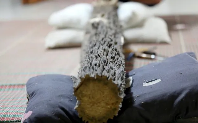 Khối trầm quý hiếm thuộc sở hữu của cơ sở trầm hương chị Hoàng Hương Lan (thôn 10, xã Phúc Trạch). Theo chị Lan, cây dó trầm này được thu mua từ hơn hai tháng trước. Chỉ đến khi tiến hành cưa xẻ thân cây, những dấu hiệu của dòng trầm tốc bông thượng hạng mới dần lộ diện.