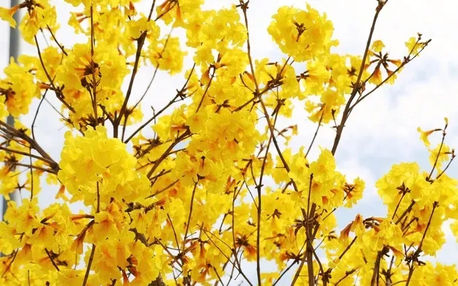 Khoảng hai tuần trở lại đây, nhiều tuyến đường trung tâm ven biển tại Hạ Long (tỉnh Quảng Ninh) được phủ kín bởi sắc vàng của hoa phong linh. Những hàng cây cao từ 3–6 m đồng loạt nở rộ, cánh hoa mỏng, vàng tươi rung rinh trong gió xuân, tạo nên bức tranh nổi bật giữa nền trời xanh và dãy núi đá vôi hùng vĩ.