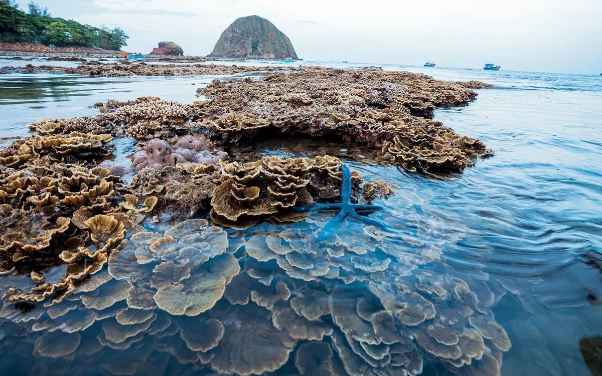 Điểm đặc biệt khiến Hòn Yến khác biệt so với nhiều đảo khác là trải nghiệm ngắm san hô ngay trên cạn. Khi thủy triều xuống, những rạn san hô vốn ẩn mình dưới nước dần lộ ra, tạo nên khung cảnh như một “kho báu” giữa đại dương.