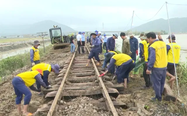 VTV.vn - Ðợt mưa lũ tại miền Trung vừa qua đã làm hư hỏng nhiều điểm trên tuyến đường sắt Bắc – Nam, khiến việc vận chuyển hành khách bị gián đoạn trong nhiều ngày qua. Ngay sau khi nước lũ rút, ngành Đường sắt đã tập trung nhân lực, vật tư khắc phục những điểm bị hư hỏng để sớm thông tuyến, đưa tàu trở lại hoạt động bình thường.