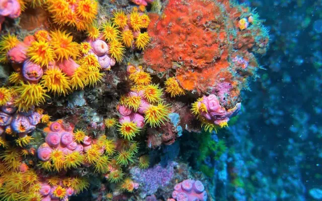 Dưới làn nước tưởng chừng tĩnh lặng, một thế giới sống động dần hiện ra, nơi những rạn san hô khoe sắc rực rỡ với các gam màu đỏ, tím, vàng, cam… được hình thành qua hàng trăm năm. Những mảng màu đan xen tạo nên bức tranh đại dương đầy cuốn hút và giàu sức sống.
