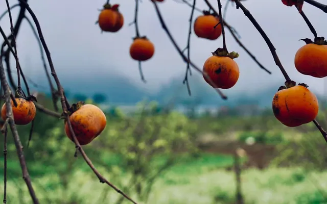 Mùa hồng Mộc Châu không bắt đầu rầm rộ mà len lỏi qua từng khu vườn tại tiểu khu Mía Đường, bản Ôn hay rải rác dọc con đường vào thung lũng Nà Ka. Điều kỳ diệu nhất của cây hồng chính là khi mùa đông cận kề, cây tự trút bỏ toàn bộ lá, chỉ còn lại những cành khẳng khiu vươn mình giữa sương giá. Nhưng chính trên những cành cây tưởng chừng khô khốc ấy, hàng trăm, hàng ngàn trái hồng chín mọng lại hiện ra, rực rỡ và kiêu hãnh.