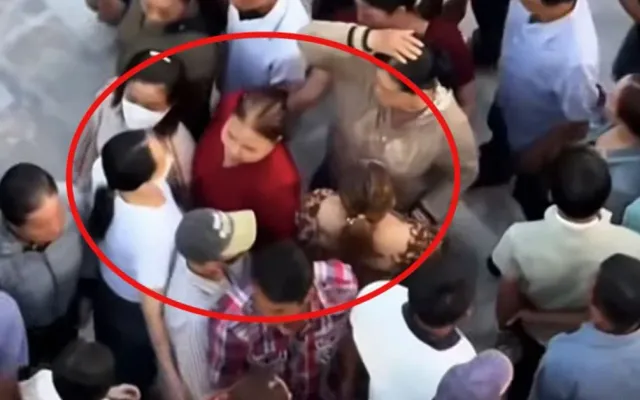 Một đoạn video cho thấy khoảng 8–10 người, gồm cả nam và nữ, tiếp cận một phụ nữ đang đứng tại khu sân trống trong khuôn viên. Nhóm người nhanh chóng vây quanh, tạo ra cảnh chen lấn hỗn loạn. Khi nạn nhân đang tìm cách thoát khỏi đám đông, một phụ nữ đứng phía sau bất ngờ thò tay giật dây chuyền trên cổ.