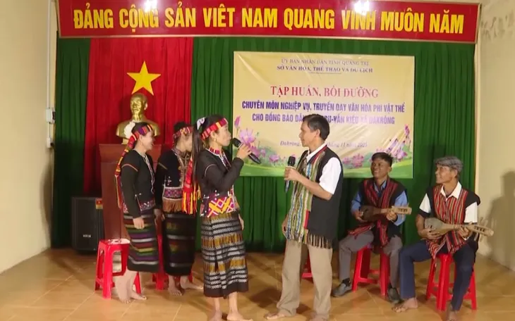 VTV.vn - Sở Văn hóa, Thể thao và Du lịch Quảng Trị vừa tổ chức Lớp tập huấn, bồi dưỡng chuyên môn nghiệp vụ, truyền dạy văn hóa phi vật thể, cho đồng bào dân tộc Bru - Vân Kiều, tại xã Ðakrông. Ðây là hoạt động nằm trong Dự án 6 “Bảo tồn, phát huy giá trị văn hóa truyền thống tốt đẹp của các dân tộc thiểu số, gắn với phát triển du lịch” thuộc Chương trình mục tiêu quốc gia phát triển kinh tế - xã hội vùng đồng bào dân tộc thiểu số và miền núi, giai đoạn 2021 - 2030 của tỉnh Quảng Trị.