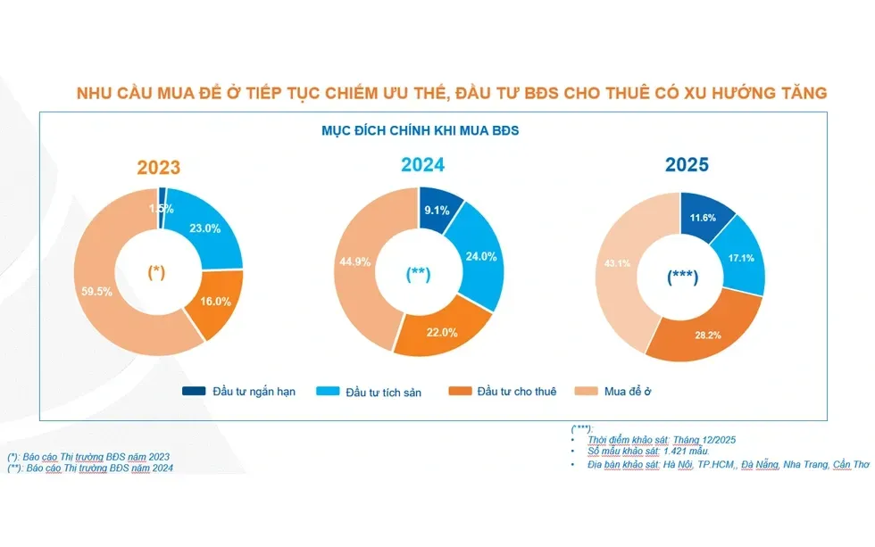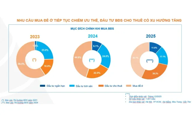 Ở chiều ngược lại, nhu cầu mua nhà để ở dù vẫn chiếm tỷ trọng chủ đạo nhưng tiếp tục suy giảm so với năm trước, trong khi mục đích mua để tích sản giảm mạnh từ 24% xuống còn 17%. So với giai đoạn thị trường trầm lắng năm 2023, nhu cầu đầu tư cho thuê và đầu tư ngắn hạn tăng rõ rệt, phản ánh sự trở lại mạnh mẽ của hoạt động đầu tư, lướt sóng bất động sản.