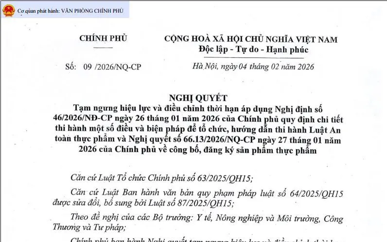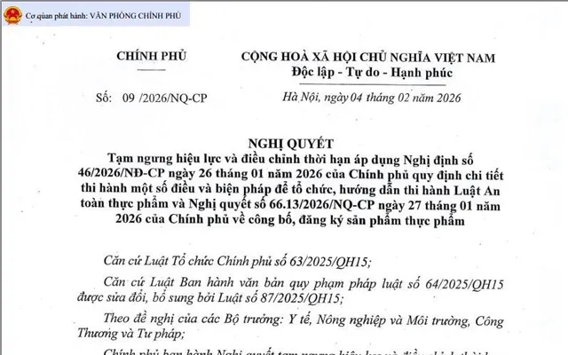 Cụ thể, Chính phủ quyết nghị tạm ngưng hiệu lực áp dụng Nghị định số 46/2026/NĐ-CP ngày 26/01/2026 của Chính phủ quy định chi tiết thi hành một số điều và biện pháp để tổ chức, hướng dẫn thi hành Luật An toàn thực phẩm và Nghị quyết số 66.13/2026/NQ-CP ngày 27/01/2026 của Chính phủ về công bố, đăng ký sản phẩm thực phẩm cho đến hết ngày 15/4/2026; các văn bản này sẽ tiếp tục có hiệu lực từ ngày 16/4/2026.