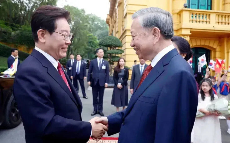 Đoàn xe hộ tống đưa Tổng thống Lee Jae Myung và Phu nhân tiến vào Phủ Chủ tịch. Tổng Bí thư, Chủ tịch nước Tô Lâm và Phu nhân ra tận thảm đỏ đón, trong không khí trang trọng. Các em thiếu nhi đã tặng hoa chào mừng Tổng thống và Phu nhân.