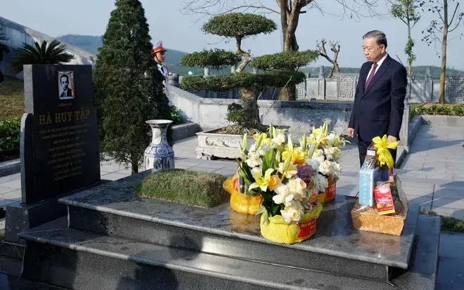 Tiếp đó, tại Khu mộ Tổng Bí thư Hà Huy Tập (huyện Cẩm Xuyên), trong không khí trang nghiêm, Tổng Bí thư Tô Lâm và các thành viên trong đoàn đã dâng hoa, dâng hương tưởng niệm, tri ân những đóng góp quan trọng của đồng chí Hà Huy Tập – nhà lãnh đạo tài năng, nhà lý luận xuất sắc của Đảng, người đã cống hiến trọn đời cho sự nghiệp cách mạng.