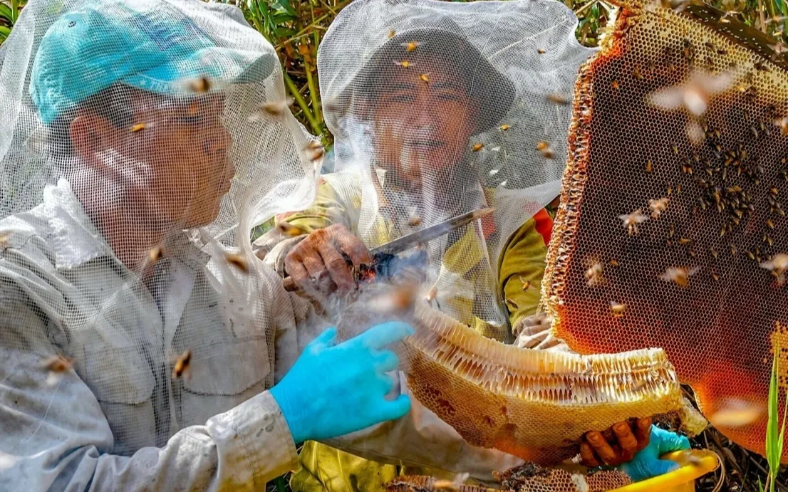 Khi thu hoạch, thợ gác kèo sử dụng đuốc xơ dừa để tạo khói, xua ong rời tổ. Nhờ đó, việc lấy mật trở nên an toàn và nhanh chóng hơn. Khi ong bay đi, người thợ dùng dao cắt phần bánh mật, toàn bộ quá trình chỉ diễn ra trong 2–3 phút với sự phối hợp của 2–3 người để tránh ong quay lại.