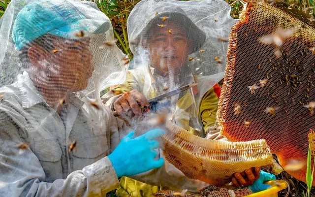 Bên cạnh hoạt động trải nghiệm, các khu du lịch còn kết hợp kinh doanh sản phẩm mật ong. Những chai mật dung tích nửa lít, giữ nguyên một phần tổ ong bên trong, được bán với giá khoảng 300.000 đồng, thu hút nhiều du khách mua làm quà.