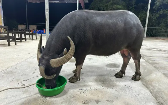 Hiện chú trâu nặng khoảng 1 tấn, cao hơn 1m, chiều dài thân khoảng 1,7m. Dù nhiều người từng hỏi mua, gia đình anh Quang không đồng ý bán vì con vật đã gắn bó từ lâu và được xem như người thân trong nhà.